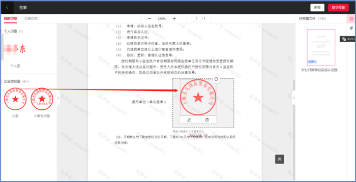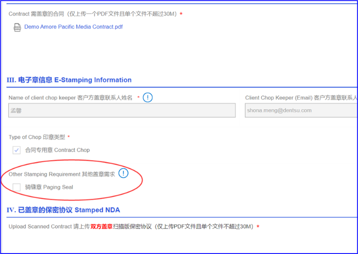 在微钉里面进行签署相关文件的上传,上传完成之后需要填写对应的盖章人信息,经办人信息,经办人联系方式,以及双方需要盖什么类型的印章。填写选择完成之后微钉会根据页面填写的信息进行发起签署。