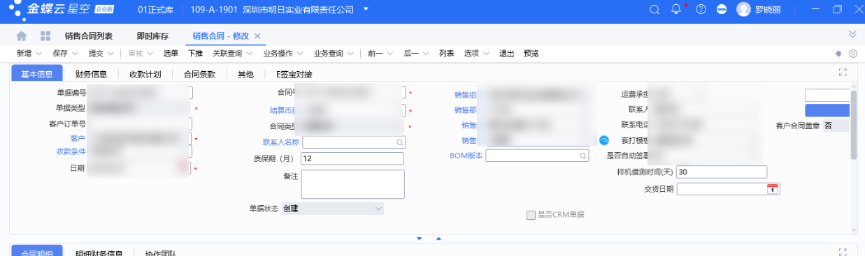 1、用户于金蝶云星空系统中,填写签约信息,发起合同签署
