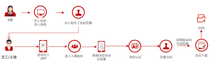 人事协议签署场景引入了e签宝电子签名,将e签宝电子签服务嵌入其内部APP系统,主要用于签署说在职/离职证明、劳动合同变更协议、劳动合同/劳动合同附件、劳动合同续签协议等;内部HR系统中集成电子签名,HR录入员工信息,由HR发起签署流程,员工通过APP接收并点击短信链接方式签署,HR在线审核、盖章归档管理。
