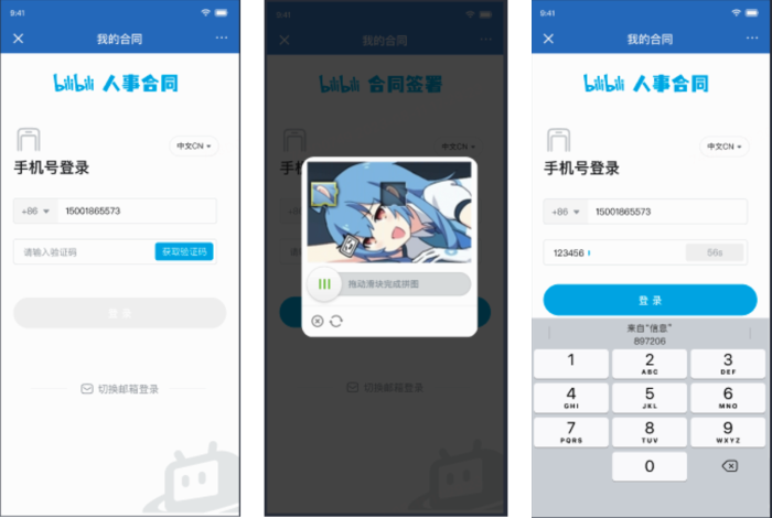 1、登录APP:签署人登录哔哩哔哩APP,输入手机号,获取手机验证码进行登录。
