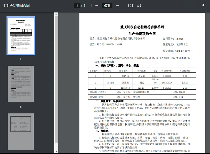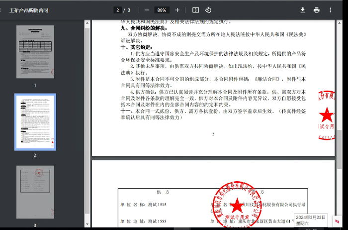 6、签署流程创建成功后,签章系统后台自动完成合同/协议文件的川仪执行器合同专用章用印;