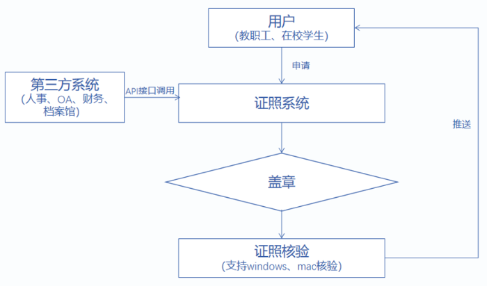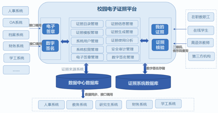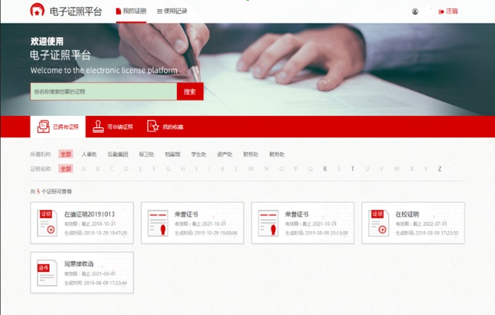 3.实现校内各类证件、相关批文、证明材料等的电子化,由电子证照平台进行可靠的数字签名后进行统一的存储、管理和共享利用。