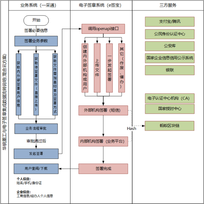 业务系统连贯性:目前客户业务系统发起审批,审批通过后,下载文件到e签宝公有云上传,发起电子签署。