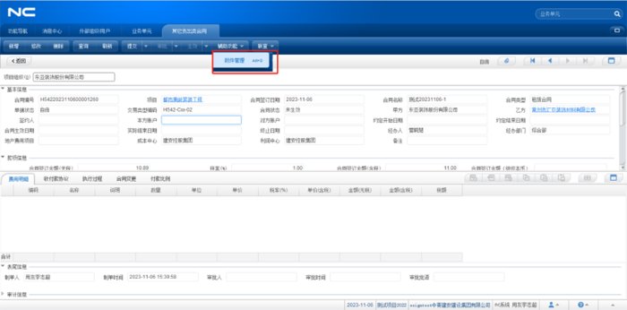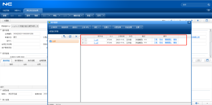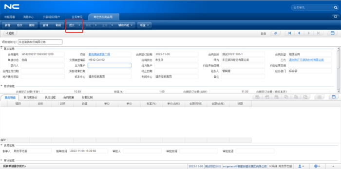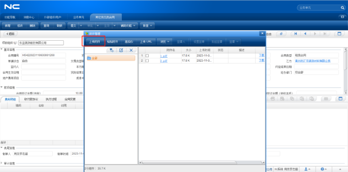 1、NC系统中录入合同、上传相关附件,提交审批。