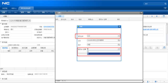 参与主体选择企业可选择“是否法人签”;选择个人签署“是否法人签”按钮为不可编辑状态。