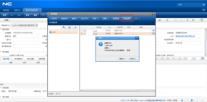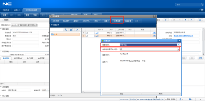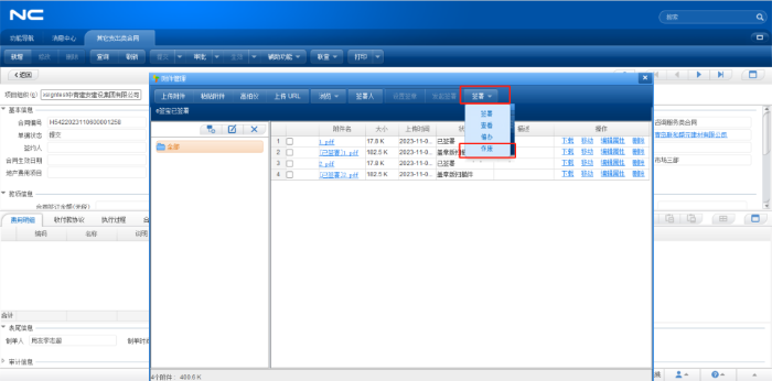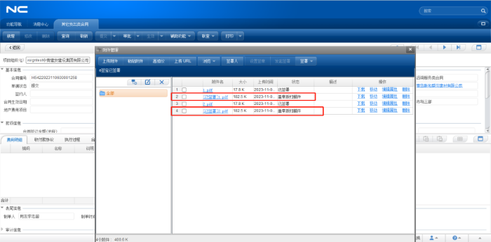 3、e签宝系统盖章,将签署文件及状态返回至NC系统(即保留原文件),注意返回的文件名+文件格式与原文件不允许重复。且作废(解约)后的文件不需要回传NC系统,只需在附件属性中返回说明。