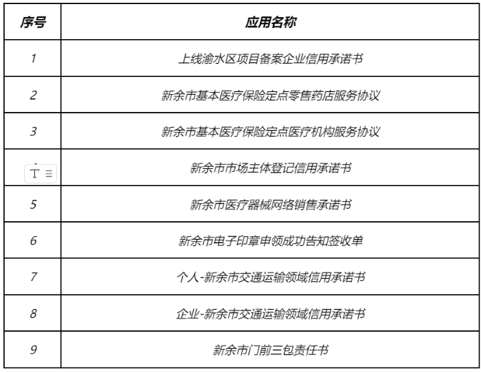 截止2024年3月份,已完成与一窗、帮代办、一件事、不动产登记、房产交易网签备案等业务系统完成对接,上线渝水区项目备案企业信用承诺书、新余市基本医疗保险定点零售药店服务协议、新余市市场主体登记信用承诺书等九个微应用,涵盖行政审批、行政执法、政务服务、不动产登记、公积金、房产交易、医疗卫生、金融服务等重点领域。