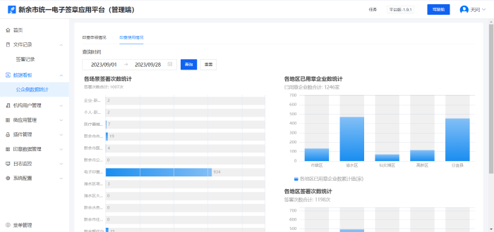 在应用推广方面,新余市申领印章企业为58119家,用章企业为10954家,用章率为63.89%,达成省里既定考核目标,并且电子印章综合考核指标排跻身全省第一梯队。