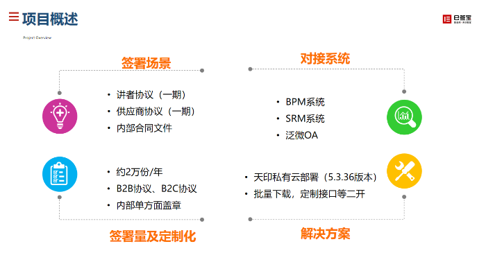 e签宝电子签章平台已在上线运行3整年,整整3期项目,其中完成了超10万份的电子合同签署,覆盖了OA、BPM/SRM、合同管理平台、CRM等超过豪森90%业务场景的签署,大大缩短豪森药业文件签署的周期以及效率,实现了豪森药业集团降本增效首要目的。
