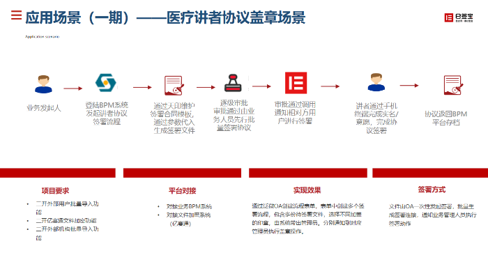 豪森药业目前最主要的应用场景还是在讲者协议签署场景,每年大约超过2W份的讲者协议需要进行签署,业务人员通过BPM录入所有合作讲者信息,随后通过天印后台维护的讲者协议模板进行调用,触发讲者协议签署,所有的讲者均通过手机终端进行签署,最终签署完成文件归档到BPM系统中。