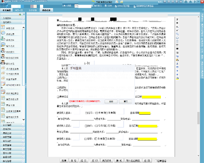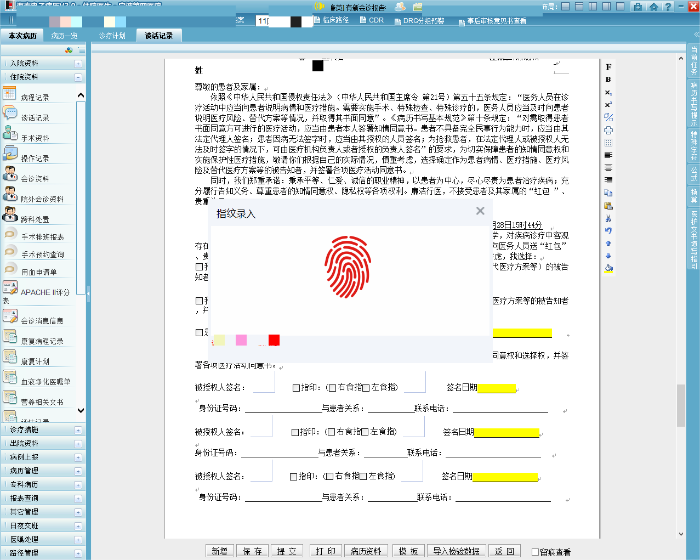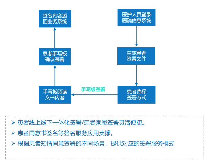 在需要患者签署文书时,如入院告知书、手术知情同意书等,由业务系统来调用手写板服务,患者通过在手写板上手写签名并按压指纹进行签署,电子签名系统将签署结果文件返回给业务系统。