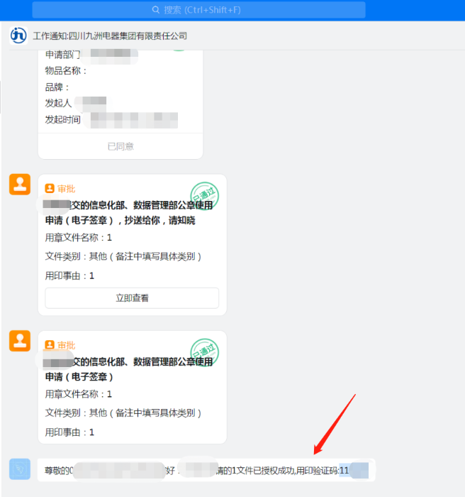 流程审批结束后,通过客户所使用的钉钉系统,会收到解锁印控仪所需的验证码。