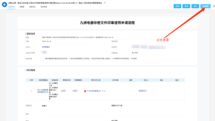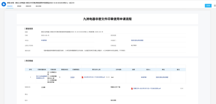 项目组对九洲集团原有的钉钉、OA上的用印流程进行改造,承接了物理印控系统及设备的对接。加强了实体印章的数字化风控管理,实现了用印记录可追溯、用印过程留痕、用印结果归档可查。