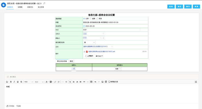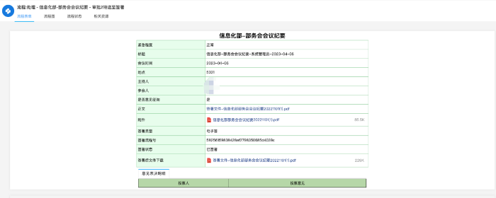 在部务会纪要流程中,我们实现了会议记录人撰写完纪要后,通过OA功能模板上传文件并填写相关信息,同时设定了参与此次会议投票的人员名单。参会者在接收到OA系统的消息提示后,可查阅会议纪要内容,并据此提交个人的投票意见。当所有参会人员均完成意见提交后,系统将自动启动签字流程。根据参会领导的意见,系统将自动在会议纪要文档的相应位置添加签名,签名的前后顺序将根据OA系统中的人员权重进行排序。