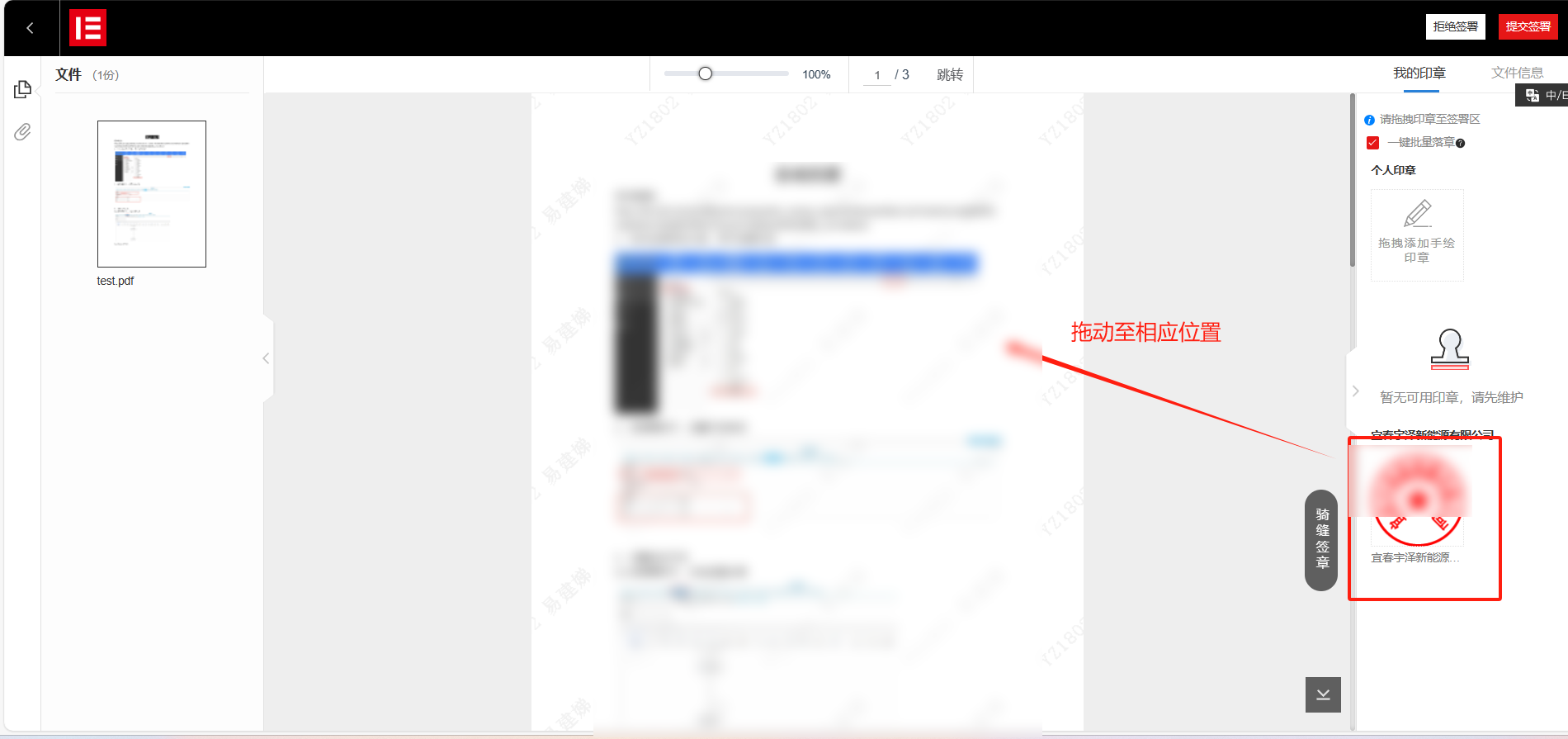 3、OA流程提交之后,登录e签宝页面点击待我签署的文件,点击签署,拖动印章到指定区域,点击提交签署,提示输入意愿签署密码