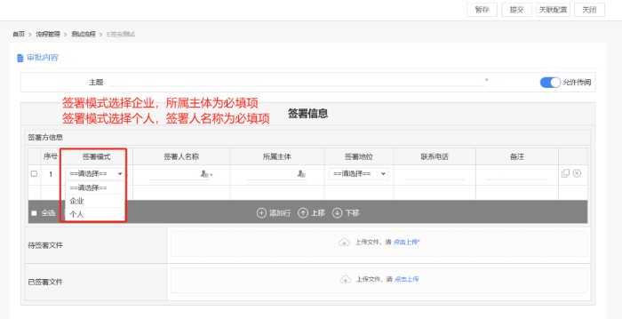 2、录入关键信息,上传需要签署的文件,填写完毕之后点击右上角提交