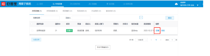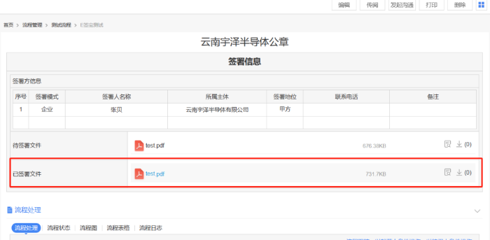 4、返回OA,可以查看发起的流程,可看到已签署的文件,可以进行在线查看或下载查看,此时流程可继续往下进行流转审批归档等操作