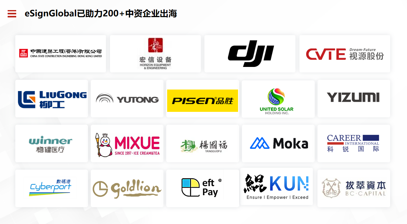 国际用户对中国品牌的顾虑,最终需要通过实际应用效果来消解。eSignGlobal已服务200余家出海企业及全球合作伙伴,其中包括中建香港、远东宏信等大型跨国企业,其全球化适配能力在真实场景中得到充分验证。
