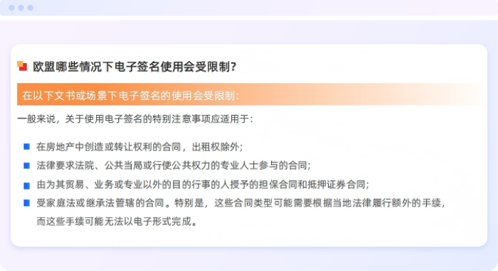 在欧盟进行房地产租赁(不包括创造或转让权利)可以使用简单电子签名,而创造或转让房地产权利的合同则受到限制;