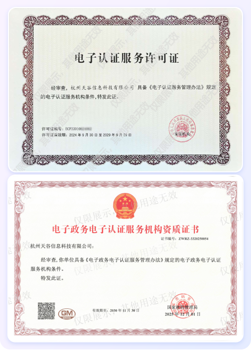 在行业资质上,e签宝持有商用密码领域的多项国家级权威认证。尤为关键的是,2024年,e签宝通过工信部严格审核,获颁电子认证服务许可证(CA牌照),成为业内首家自主申请获颁此牌照的服务商。2025年,e签宝通过国家密码管理局的资质审查,获颁《电子政务电子认证服务机构资质证书》(政务CA证书),成为浙江省首家获政务CA证书的民营企业。
